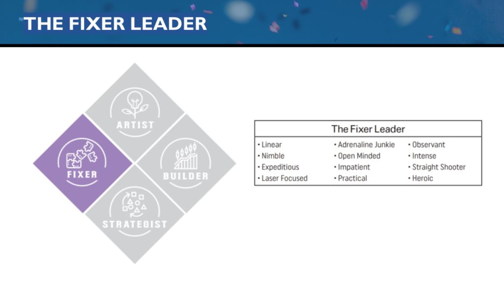 The Fixer’s leadership skills allow him or her to see what’s broken, and then laser-focus on the problem-solving needed to fix it.